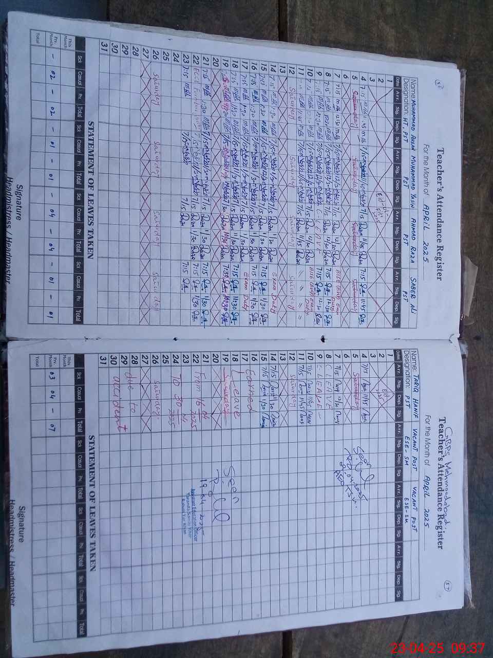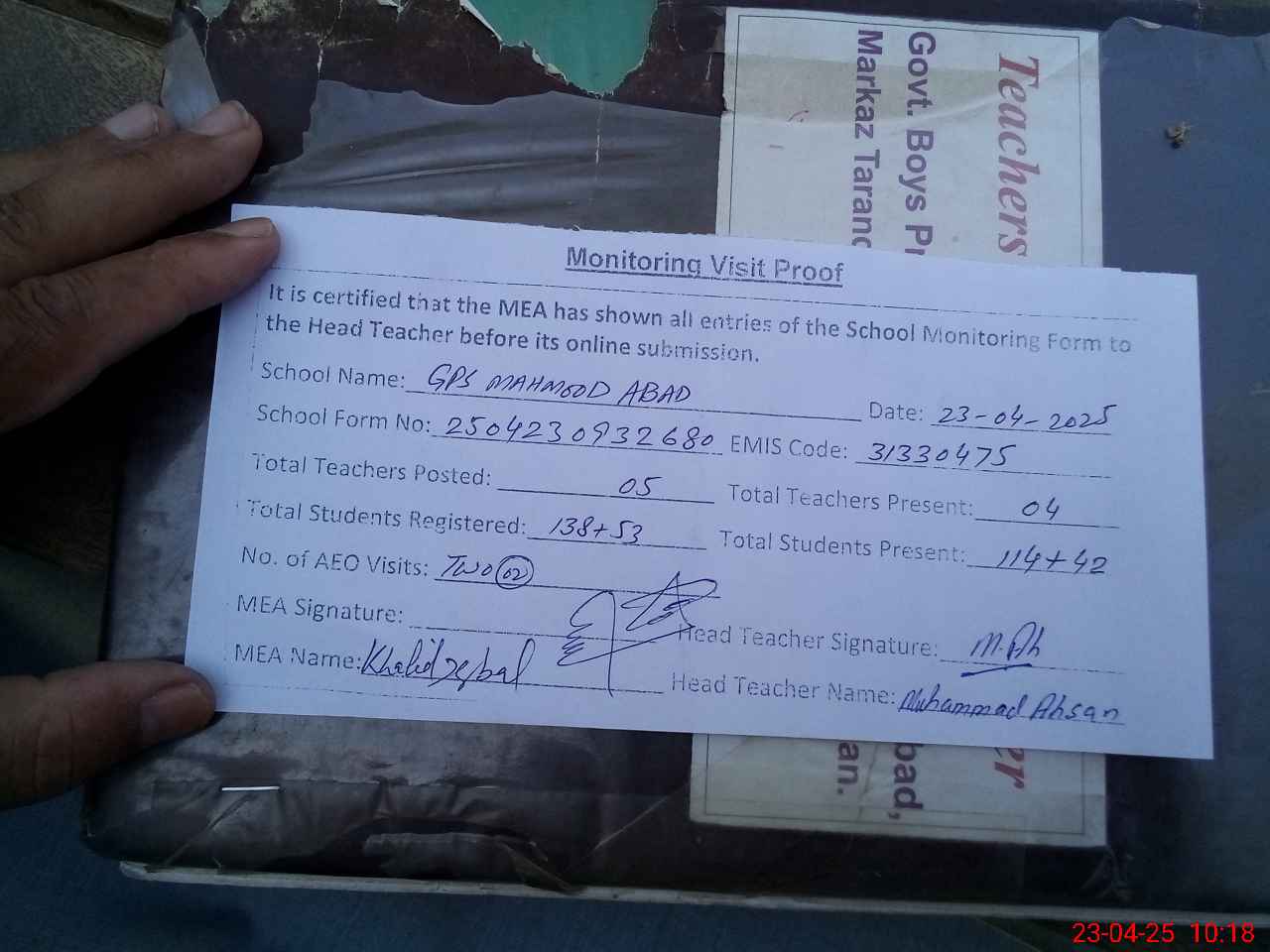 | Attendance Register | Head Teacher | MEA with School | Visit Proof |