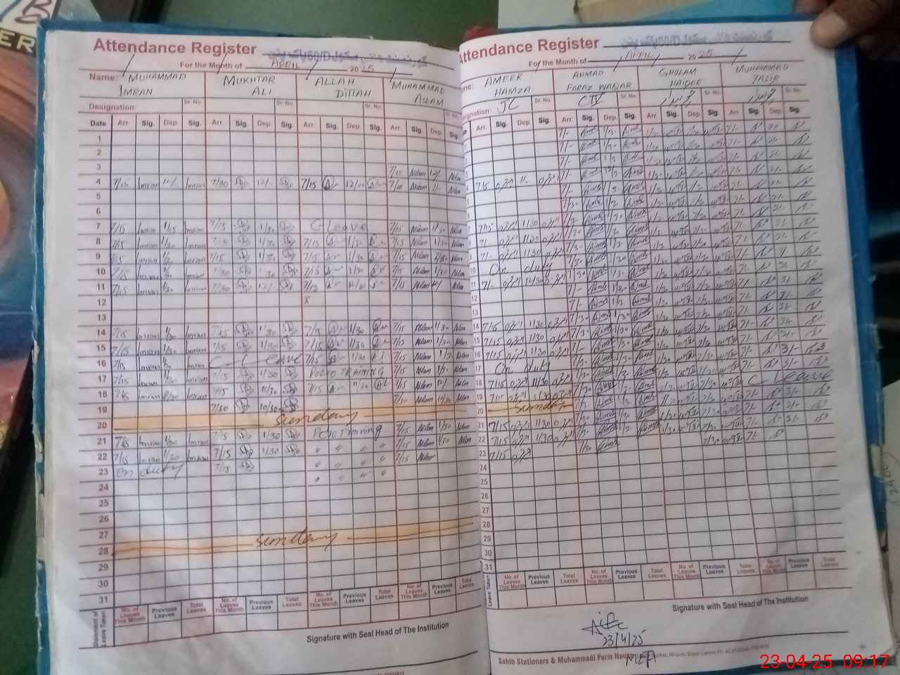 | CNIC | Full Name | Designation | R/C | Absence During Last Calender Month |