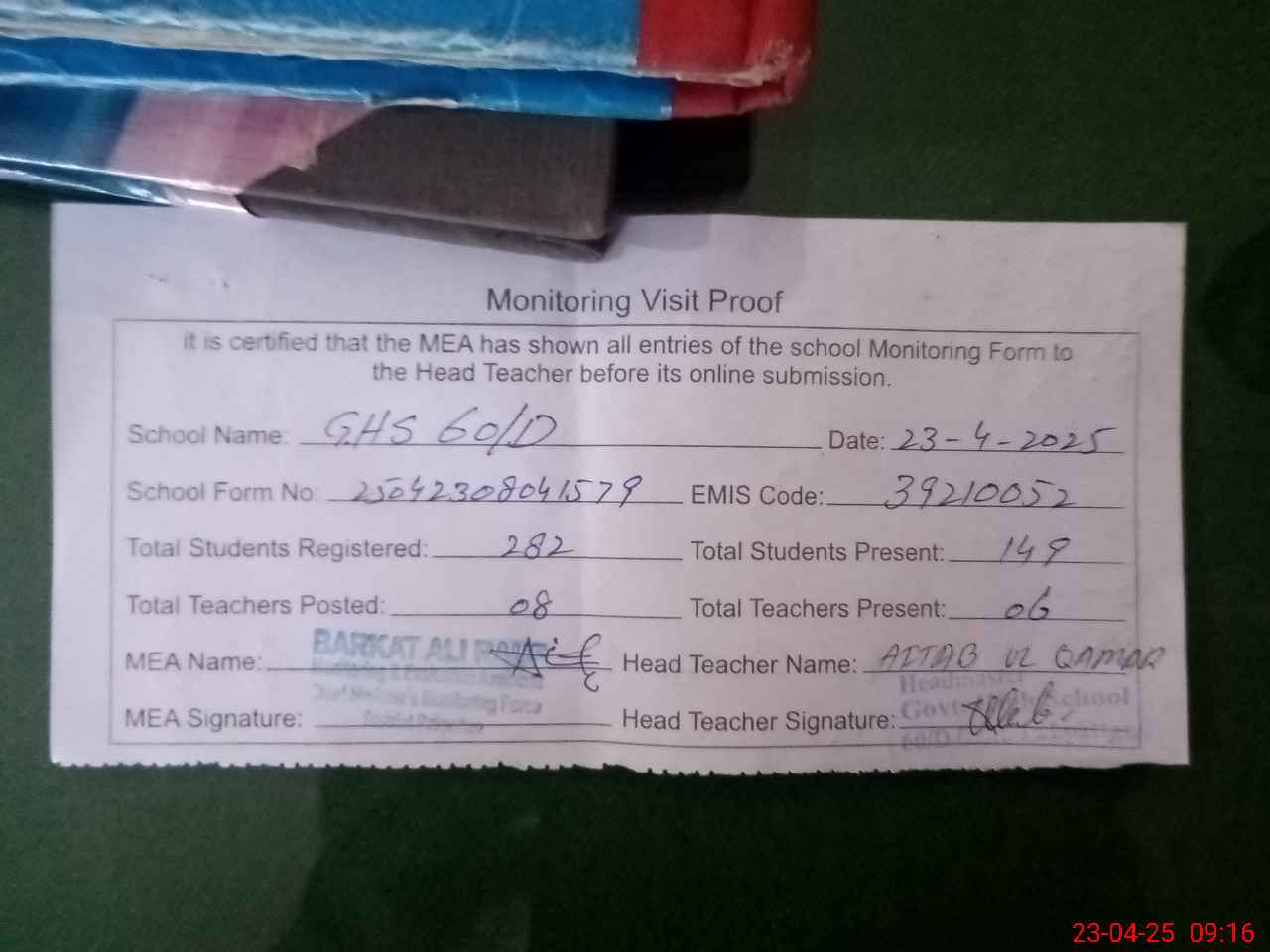 | Attendance Register | Head Teacher | MEA with School | Visit Proof |