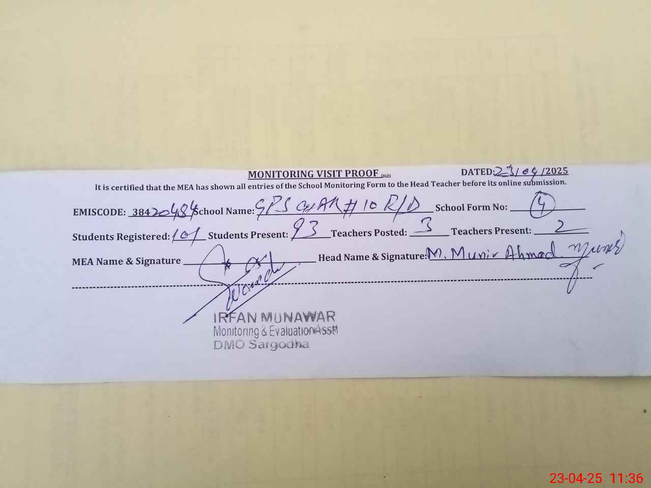 | Attendance Register | Head Teacher | MEA with School | Visit Proof |