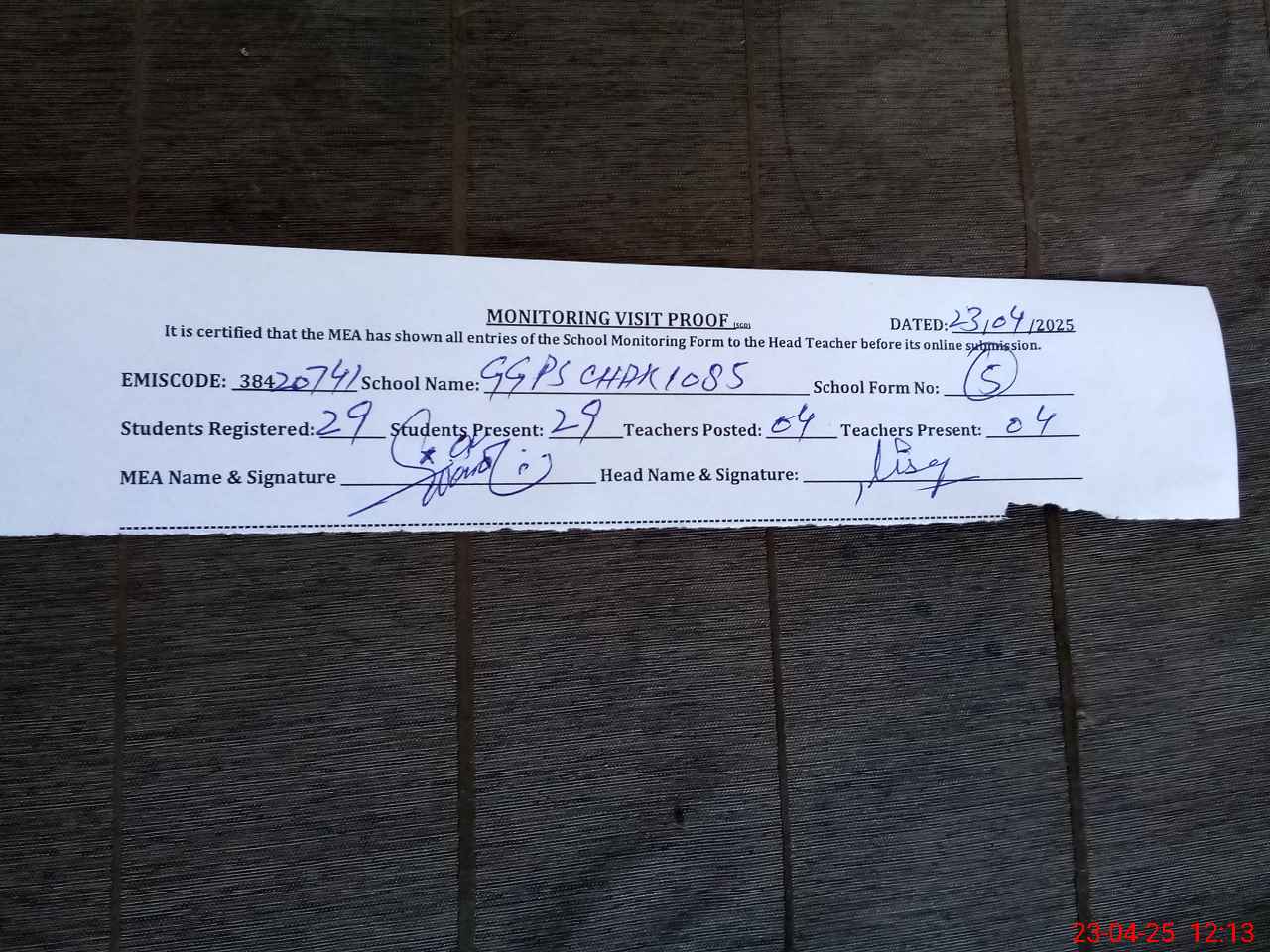 | Attendance Register | Head Teacher | MEA with School | Visit Proof |