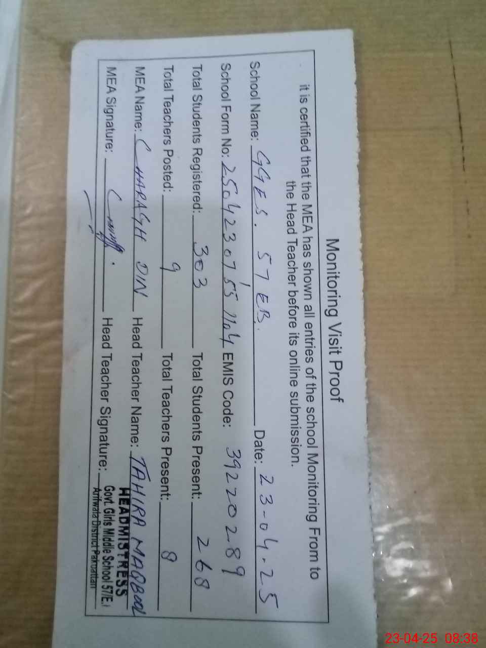 | Attendance Register | Head Teacher | MEA with School | Visit Proof |
