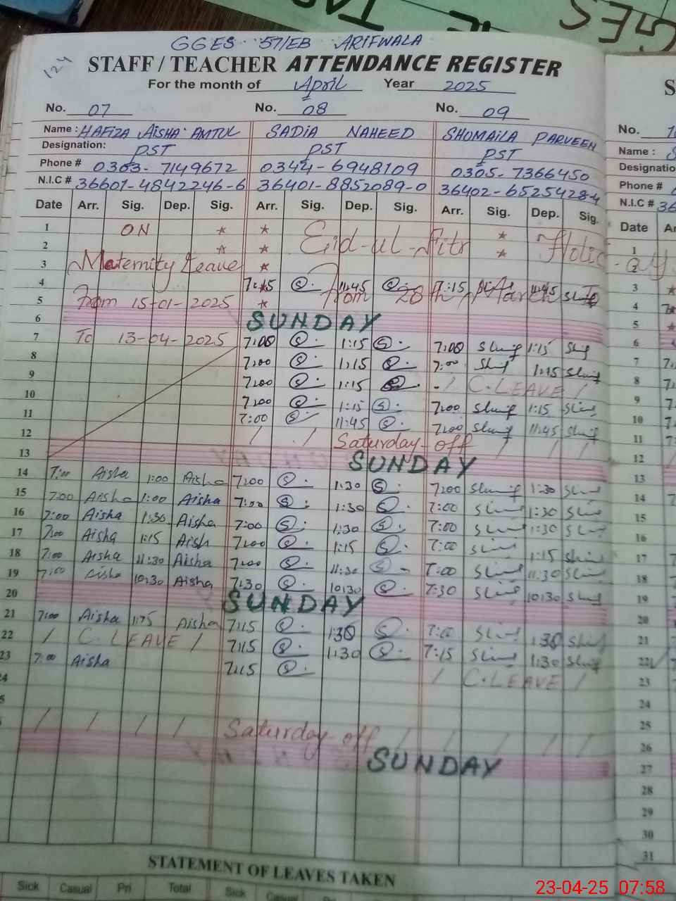 | CNIC | Full Name | Designation | R/C | Absence During Last Calender Month |