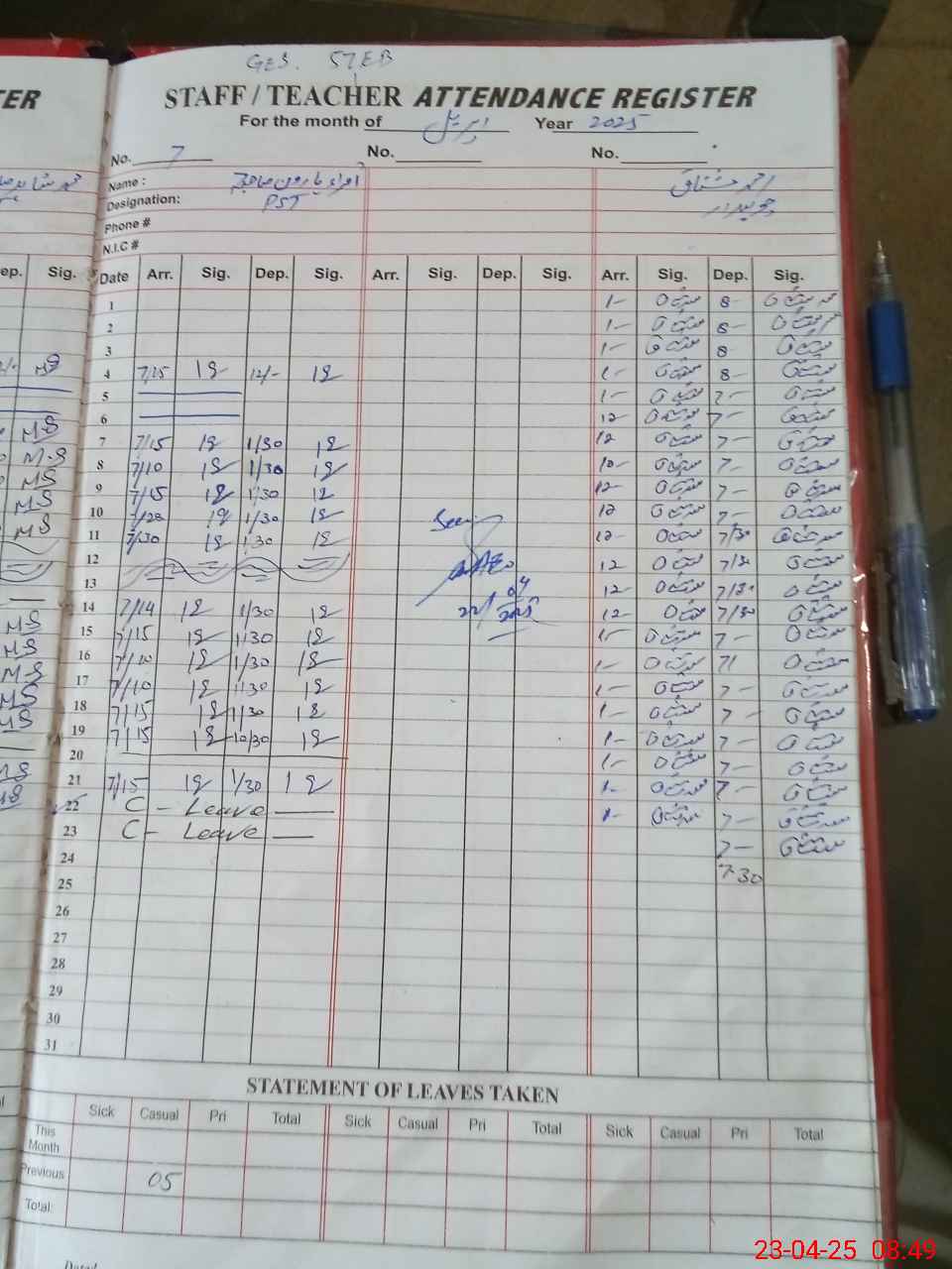 | CNIC | Full Name | Designation | R/C | Absence During Last Calender Month |