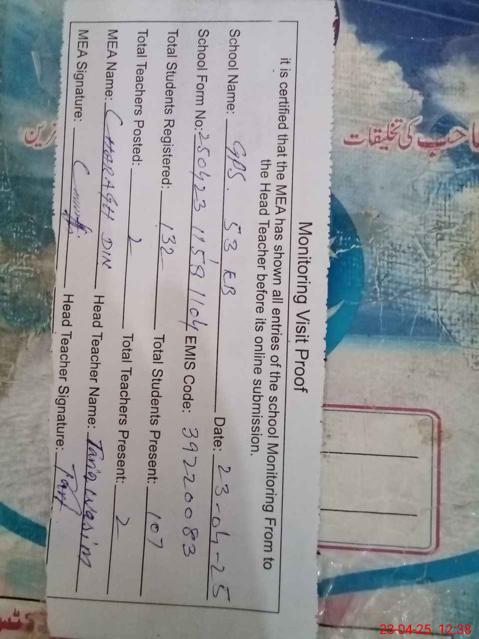| EMIS Code: 39220083 | Name of School: GPS 53 EB P/O ARIF WALA | |||