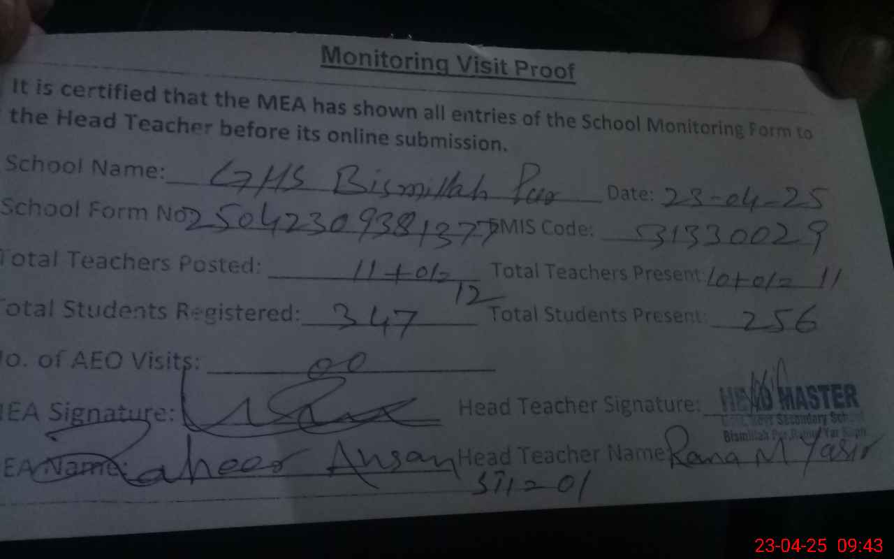 | EMIS Code: 31330029 | Name of School: GHS BISMILLAH PUR | |||