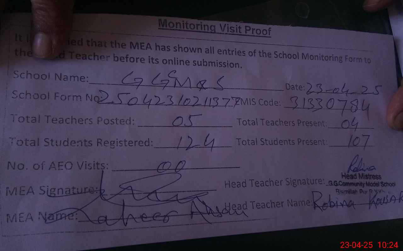| EMIS Code: 31330784 | Name of School: GGCMS BISMILLAH PUR | |||