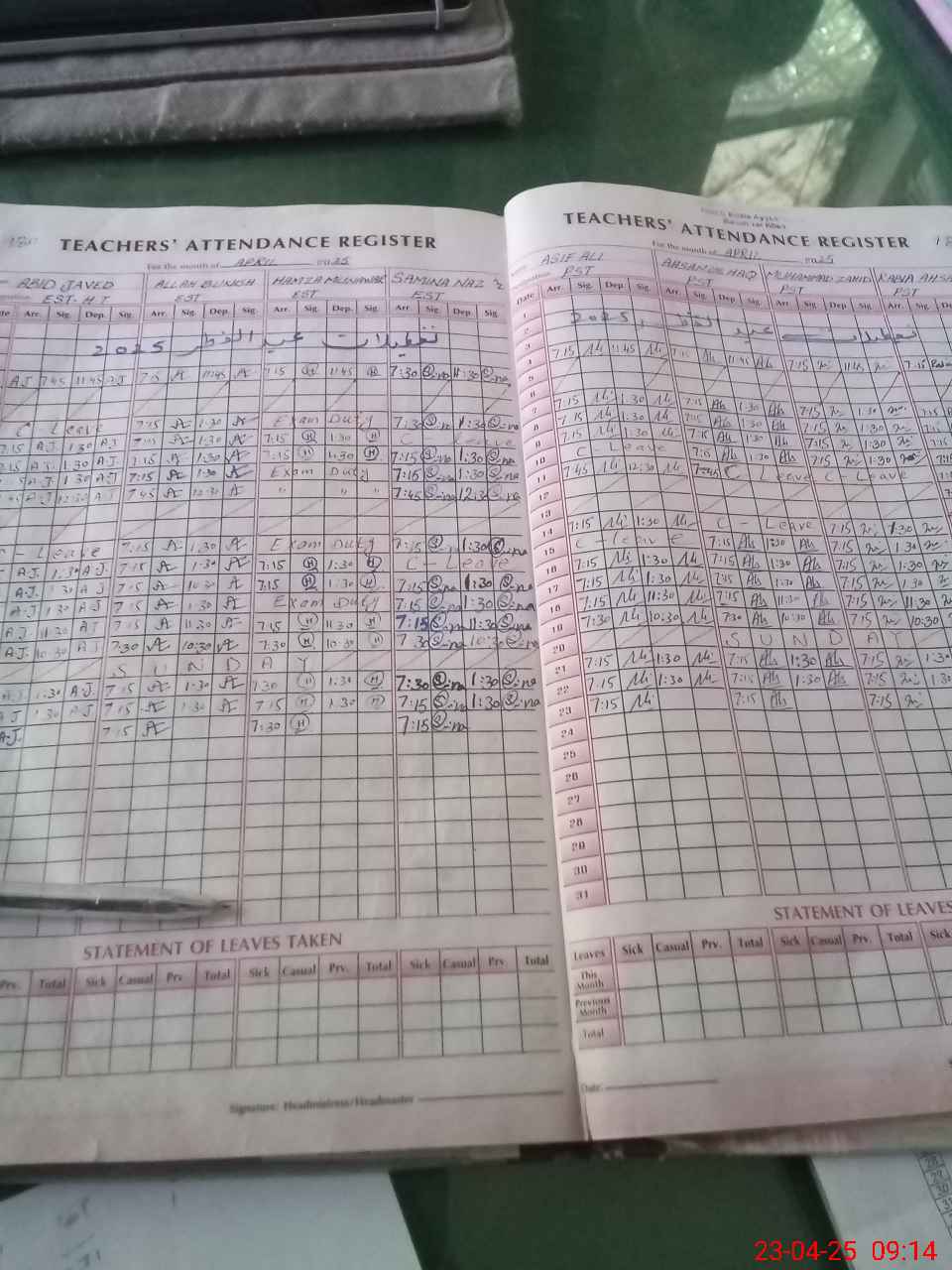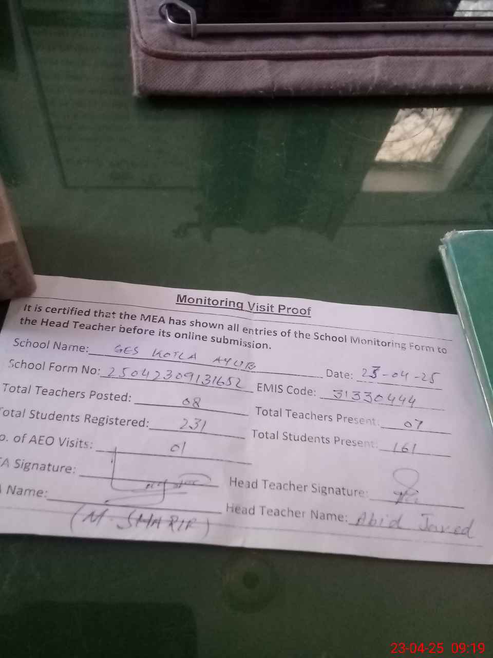 | Attendance Register | Head Teacher | MEA with School | Visit Proof |