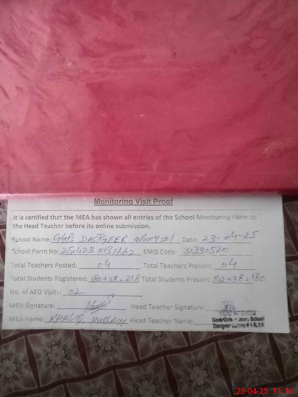 | Attendance Register | Head Teacher | MEA with School | Visit Proof |