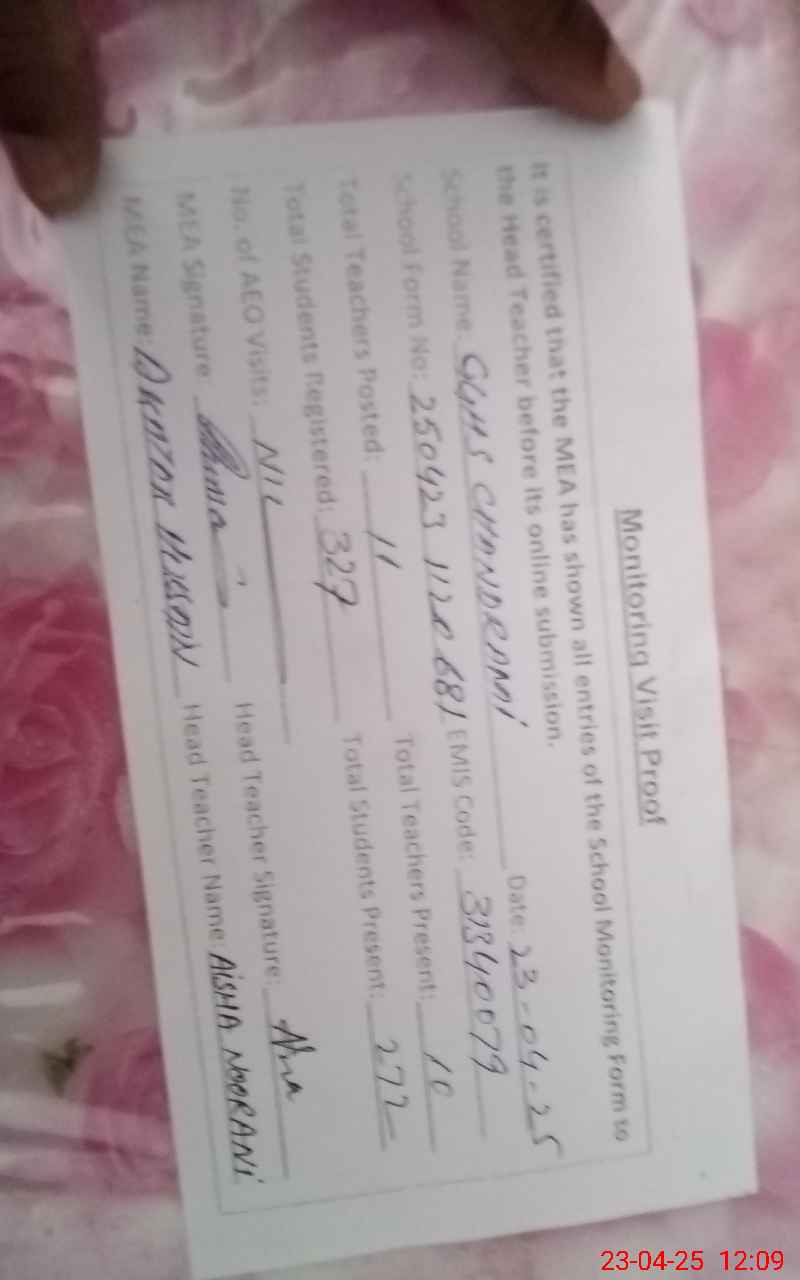 | Attendance Register | Head Teacher | MEA with School | Visit Proof |