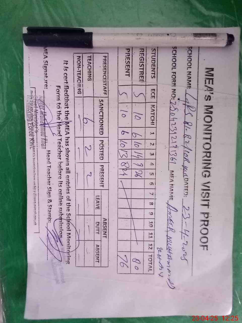 | Attendance Register | Head Teacher | MEA with School | Visit Proof |