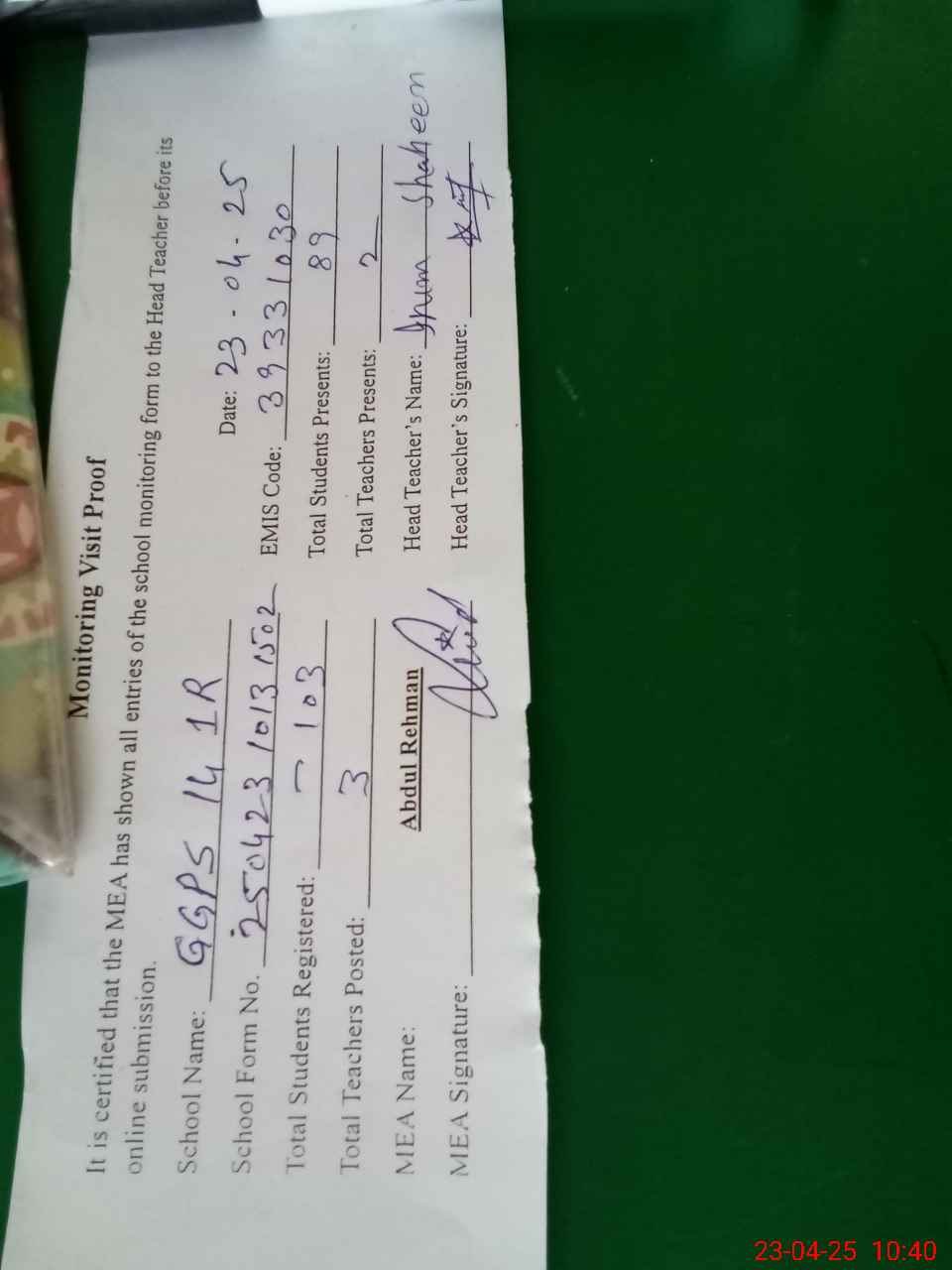 | Attendance Register | Head Teacher | MEA with School | Visit Proof |