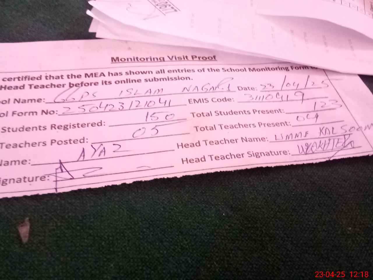 | Attendance Register | Head Teacher | MEA with School | Visit Proof |