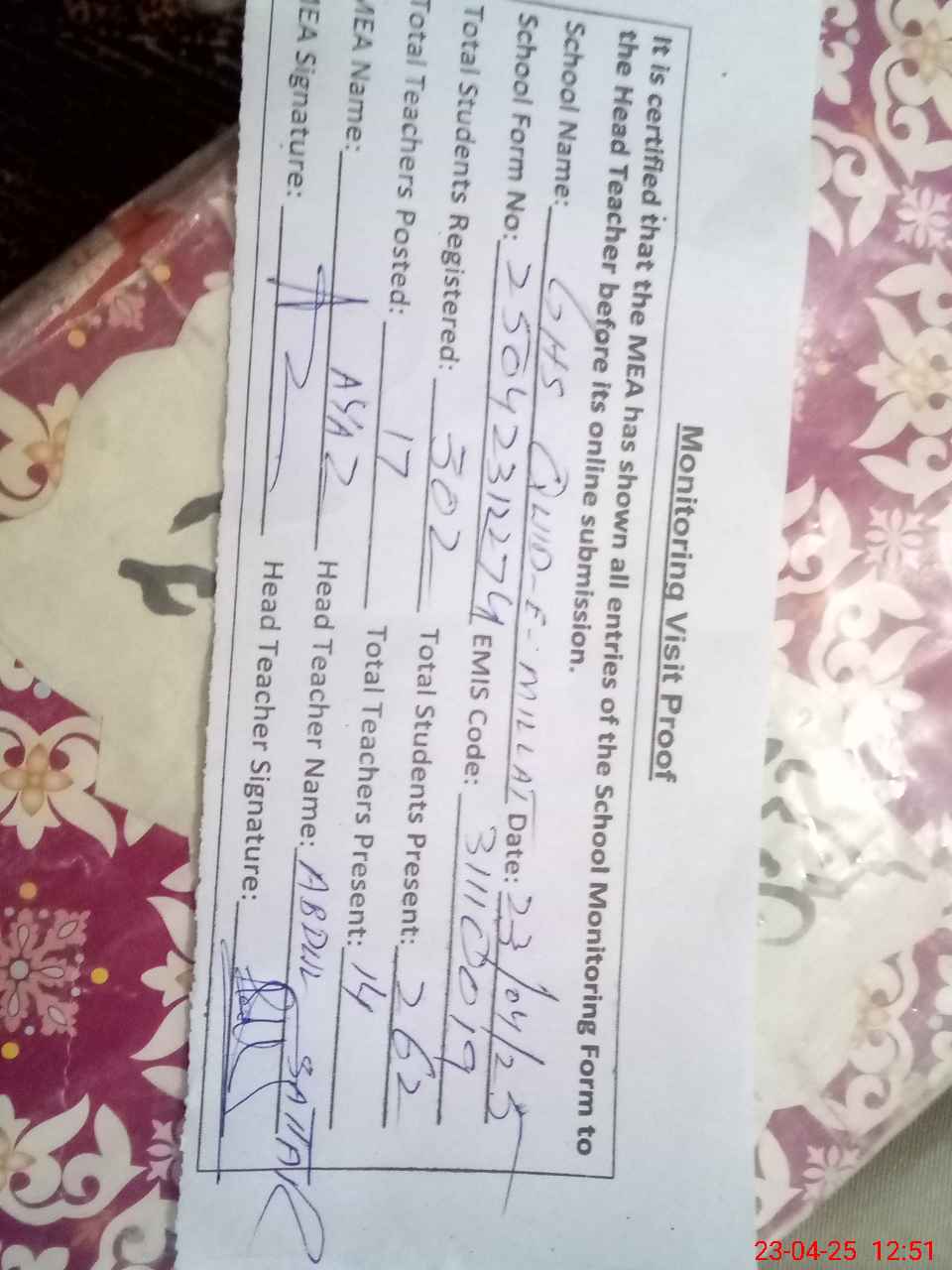 | Certified that this School was Inspected by the Undersigned MEA/DMO Today and the Information Stated Above is as Per Record. | |||||