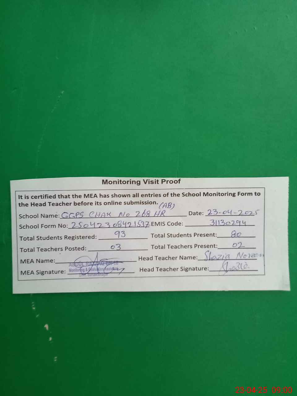| EMIS Code: 31130294 | Name of School: GGPS CHAK NO 268 HR PUL BASTI | |||
