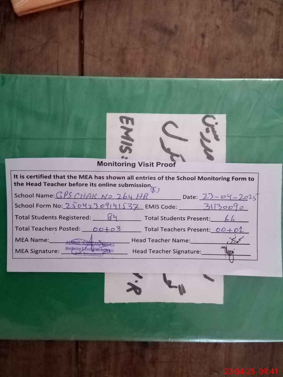 | EMIS Code: 31130090 | Name of School: GPS CHAK NO. 264 HR EAST | |||
