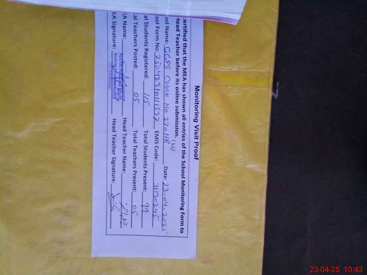 | Attendance Register | Head Teacher | MEA with School | Visit Proof |