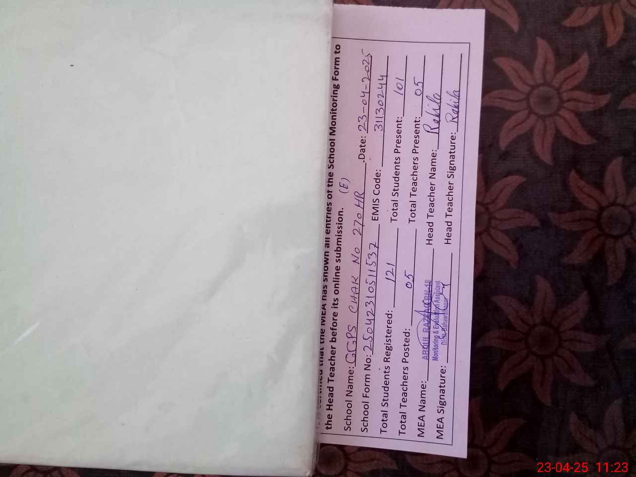 | Attendance Register | Head Teacher | MEA with School | Visit Proof |