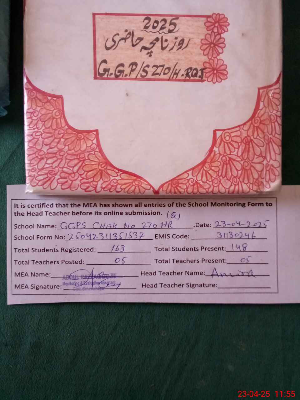 | Attendance Register | Head Teacher | MEA with School | Visit Proof |