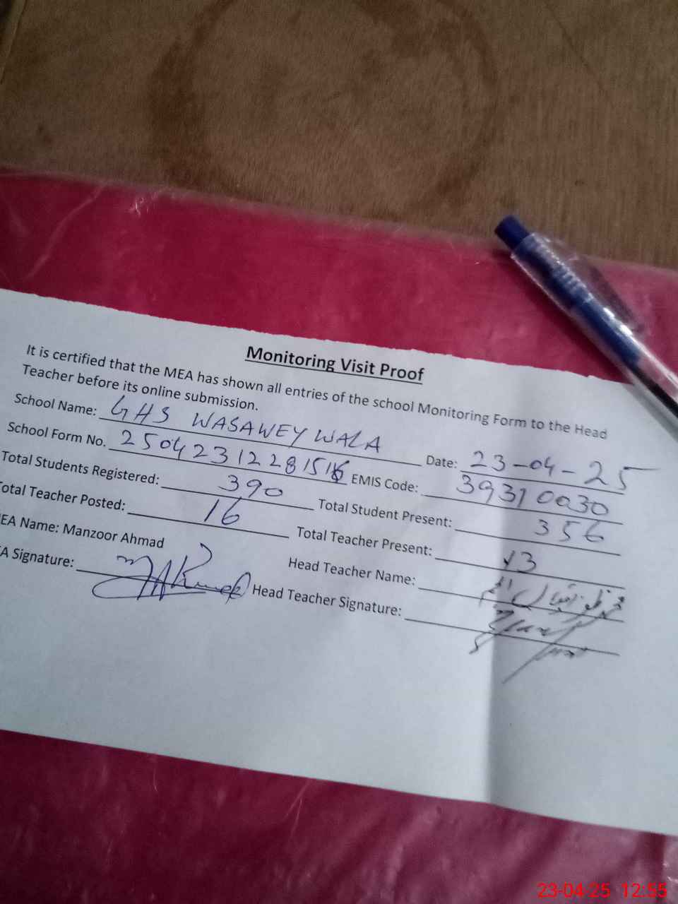| EMIS Code: 39310030 | Name of School: GHS WASAWEY WALA | |||