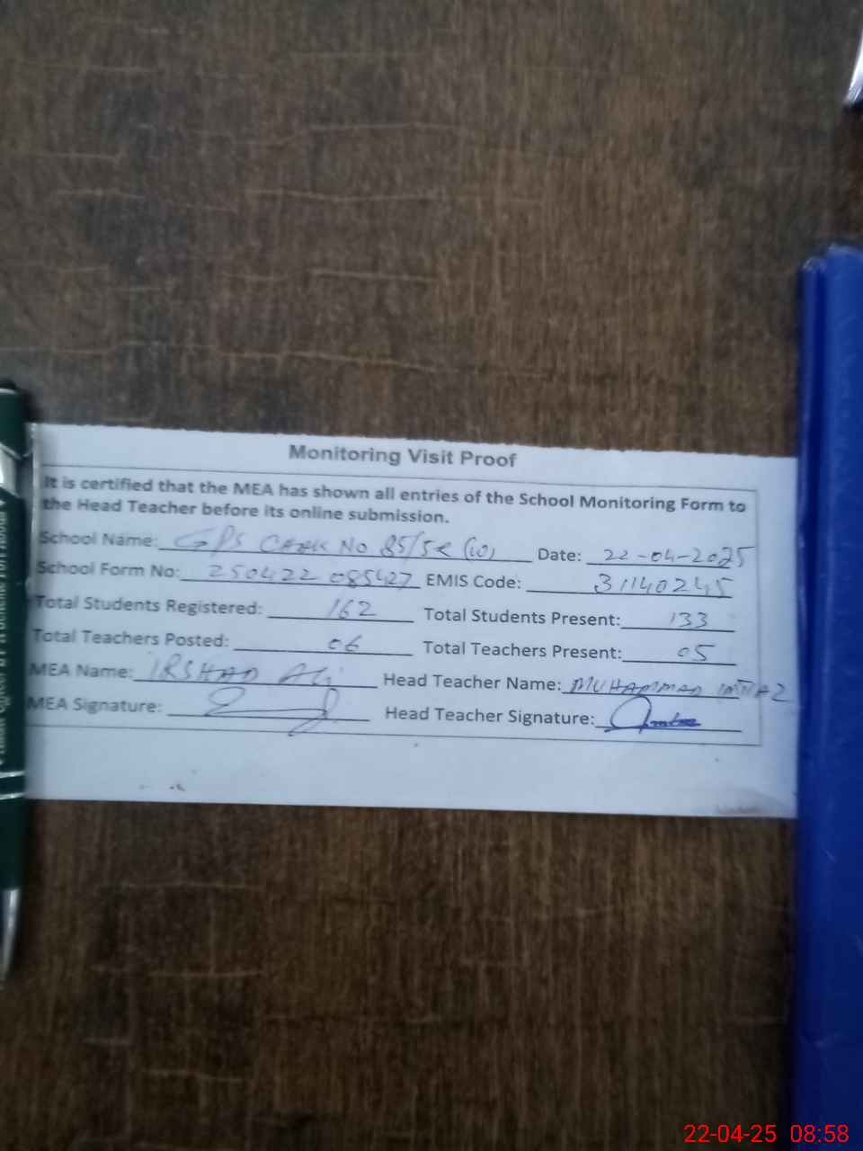 | Attendance Register | Head Teacher | MEA with School | Visit Proof |