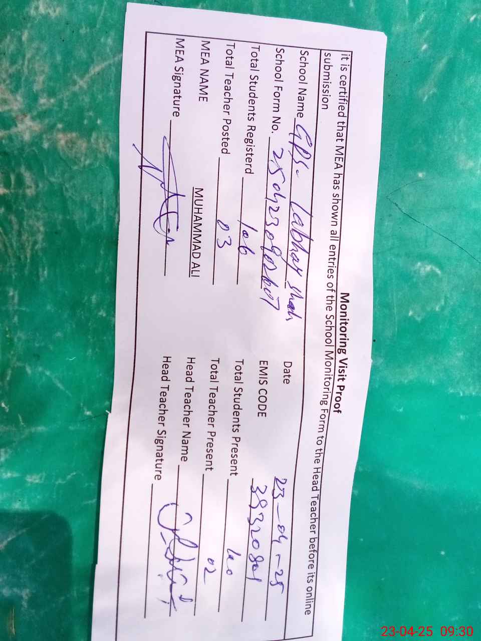 | Certified that this School was Inspected by the Undersigned MEA/DMO Today and the Information Stated Above is as Per Record. | |||||