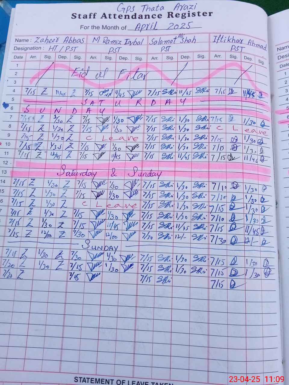 | CNIC | Full Name | Designation | R/C | Absence During Last Calender Month |