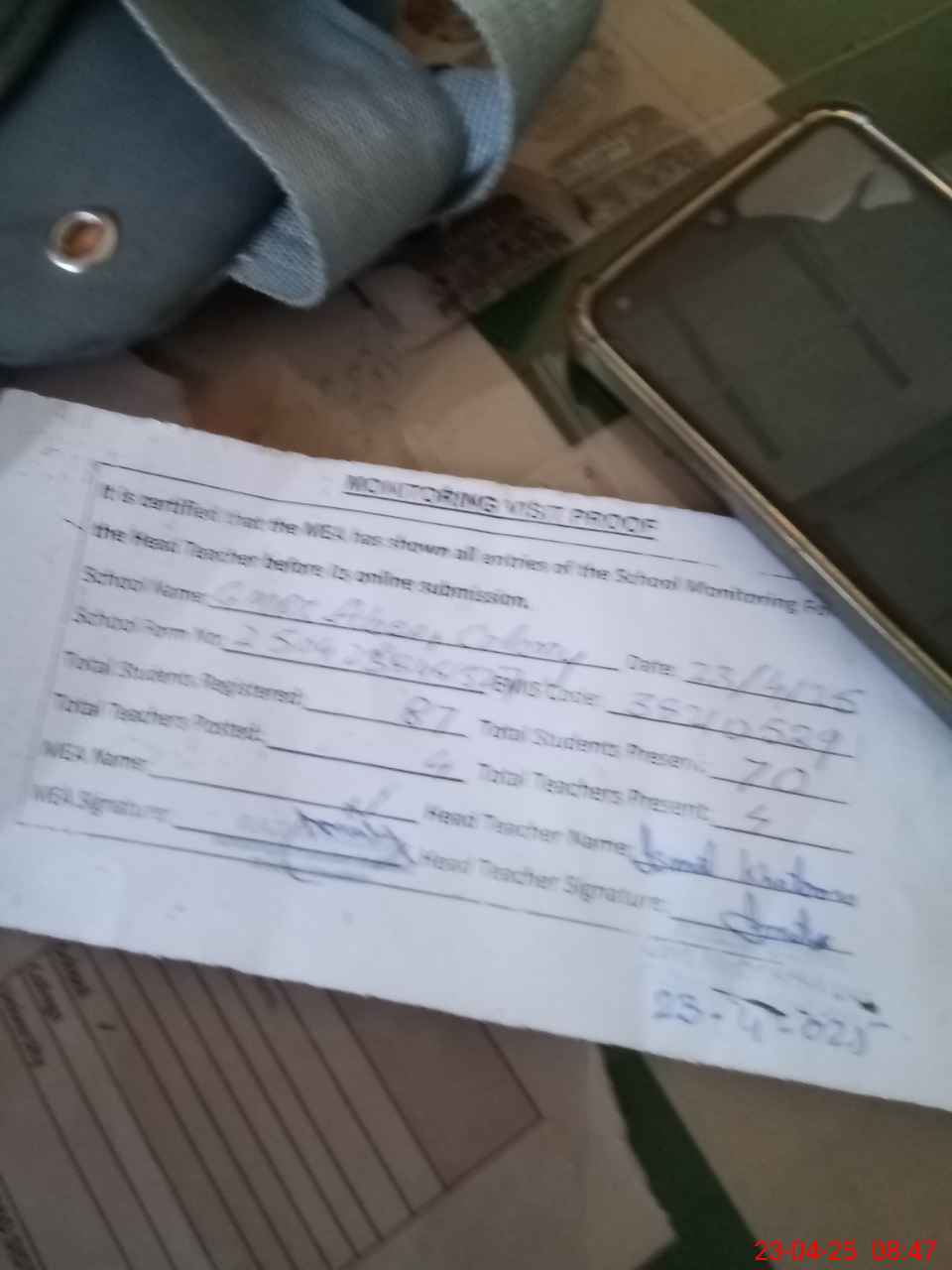 | Attendance Register | Head Teacher | MEA with School | Visit Proof |