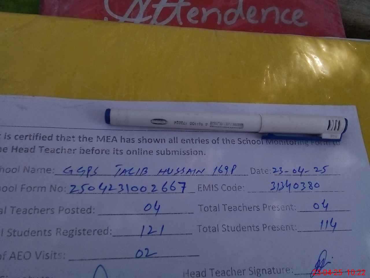 | Attendance Register | Head Teacher | MEA with School | Visit Proof |