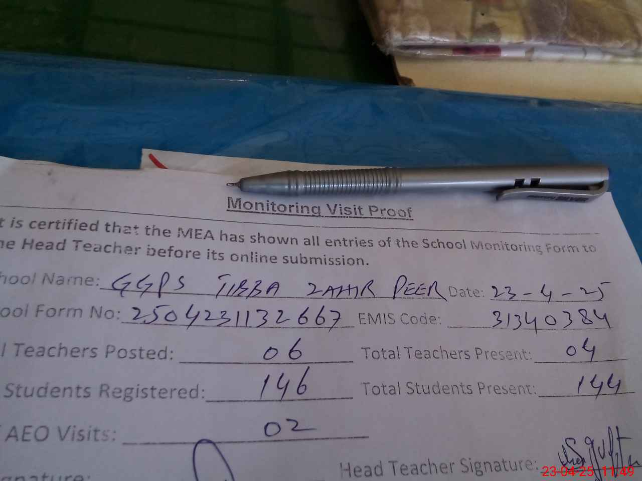| Attendance Register | Head Teacher | MEA with School | Visit Proof |