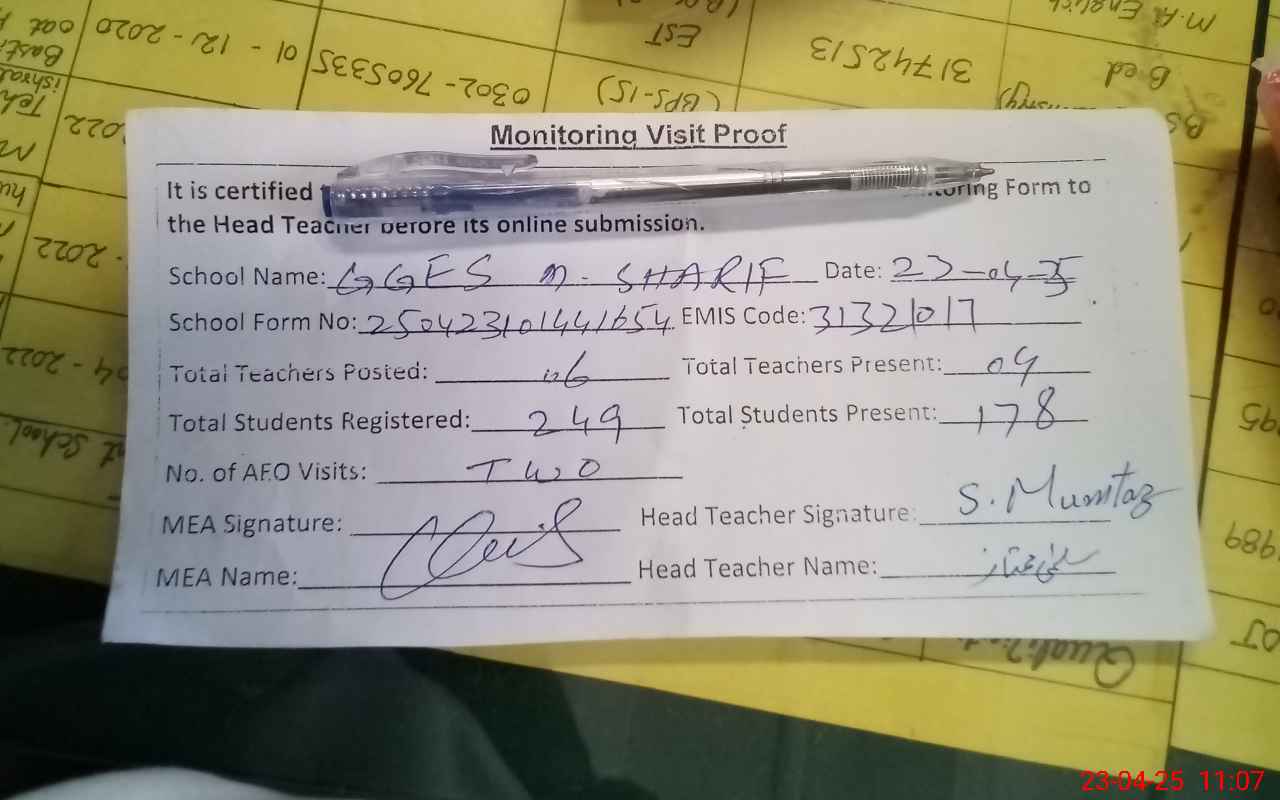| Attendance Register | Head Teacher | MEA with School | Visit Proof |