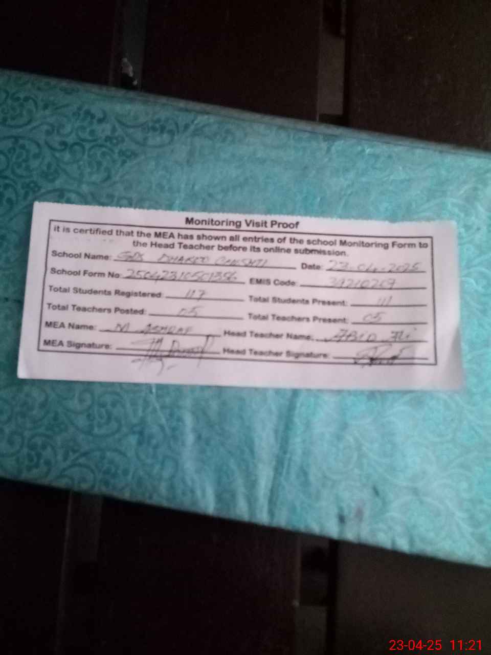 | Attendance Register | Head Teacher | MEA with School | Visit Proof |