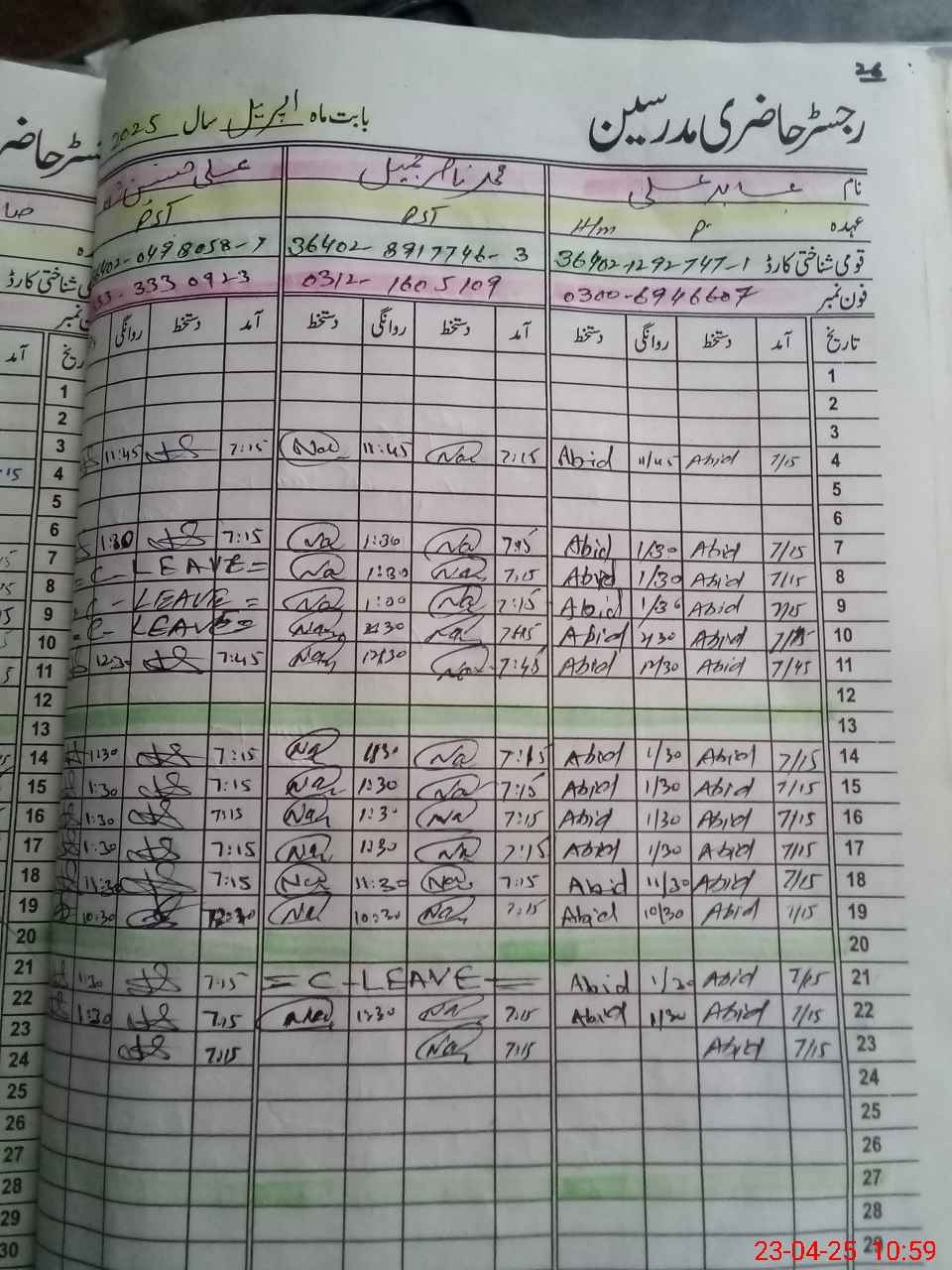 | CNIC | Full Name | Designation | R/C | Absence during last cal. month |