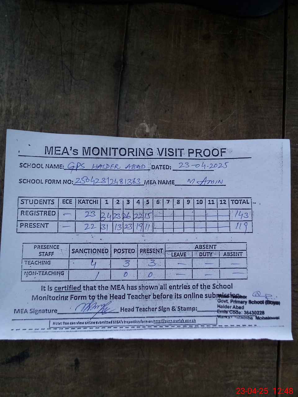 | Attendance Register | Head Teacher | MEA with School | Visit Proof |