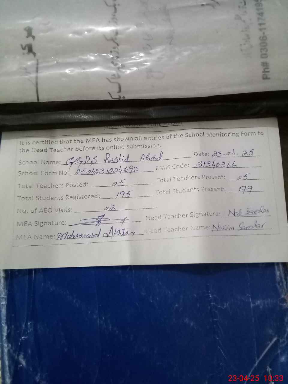 | Name: NA**** SA**** Designation: (School Headmaster's/Headmistress's) EST Phone/Cell Number: 03**** |