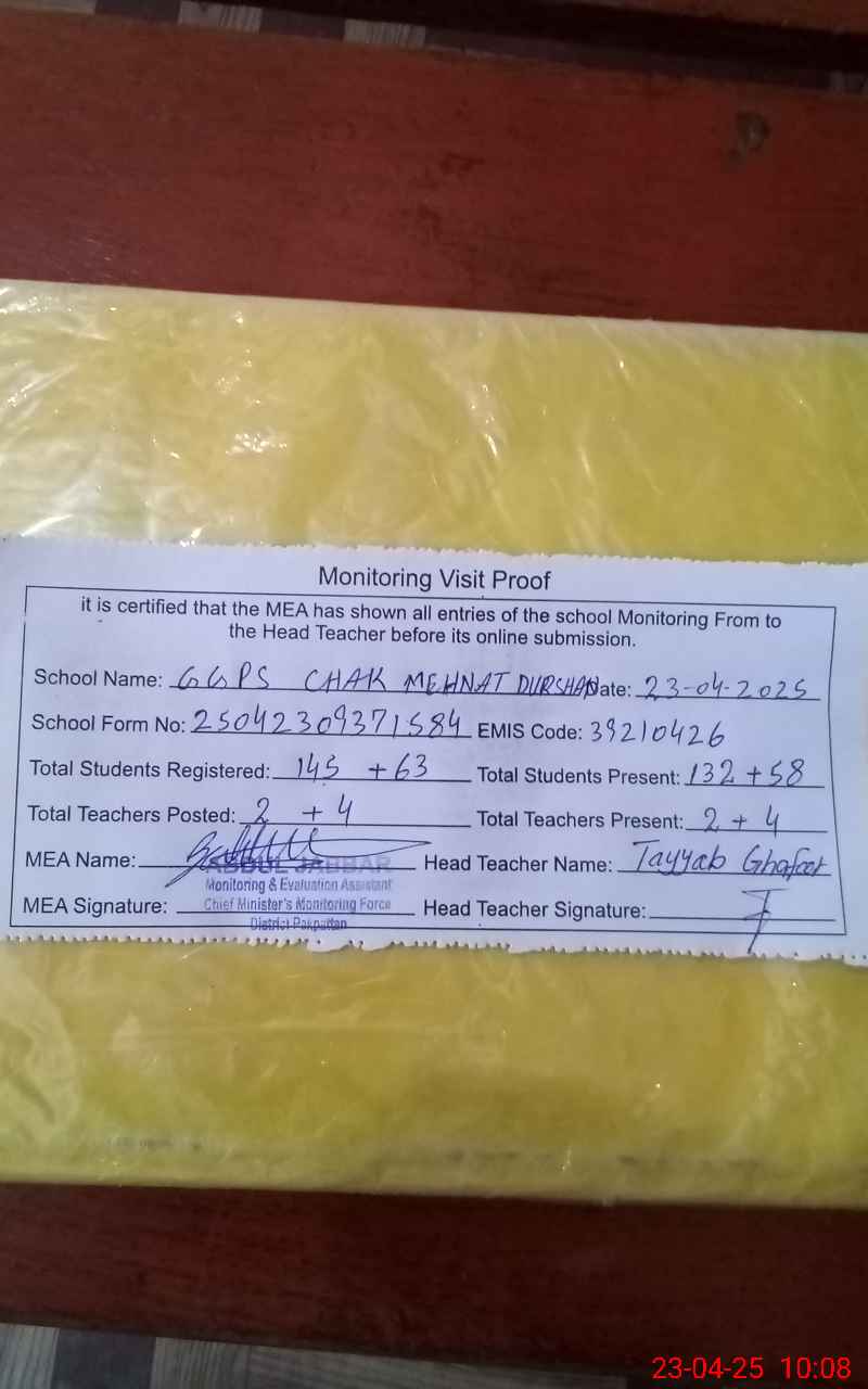 | EMIS Code: 39210426 | Name of School: GGPS CHAK MEHNAT DURSHAN | |||