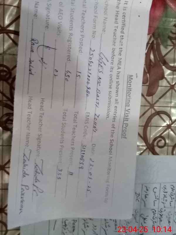 | Attendance Register | Head Teacher | MEA with School | Visit Proof |