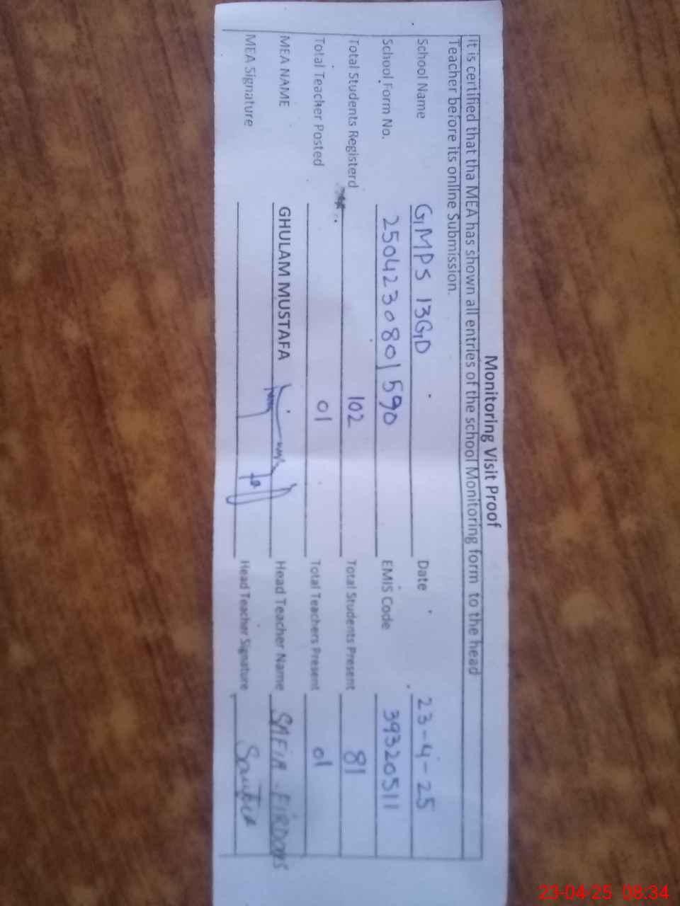 | Attendance Register | Head Teacher | MEA with School | Visit Proof |