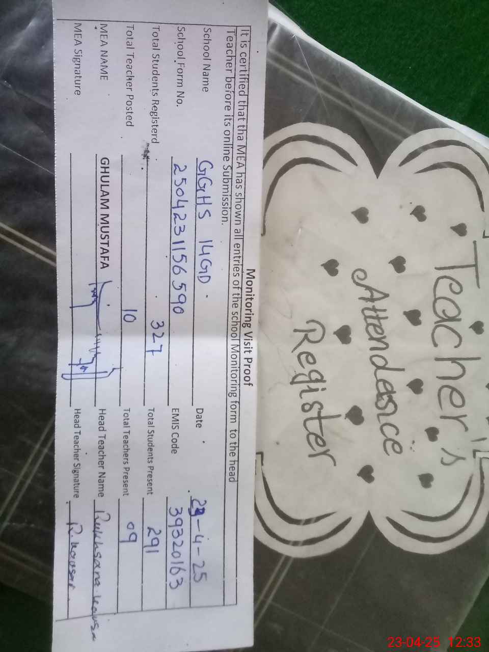 | EMIS Code: 39320163 | Name of School: GGHS CHAK NO. 14/G.D | |||