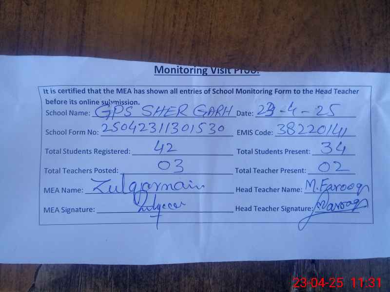 | EMIS Code: 38220141 | Name of School: GPS SHER GARH | |||