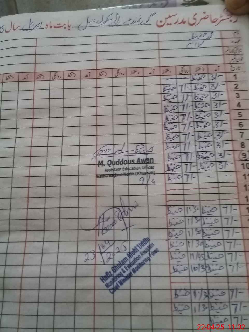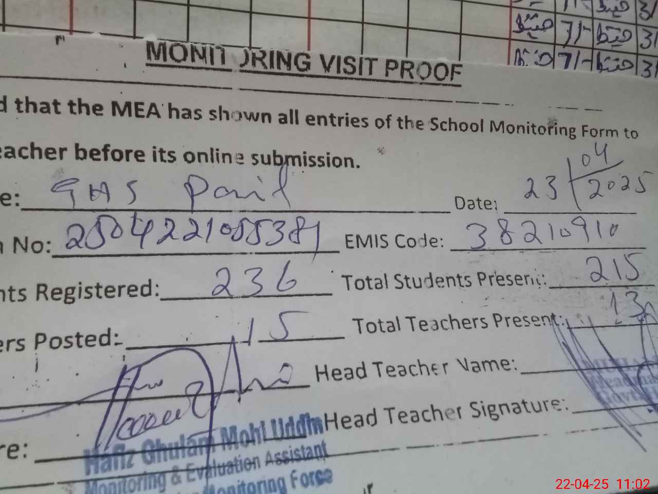 | Attendance Register | Head Teacher | MEA with School | Visit Proof |