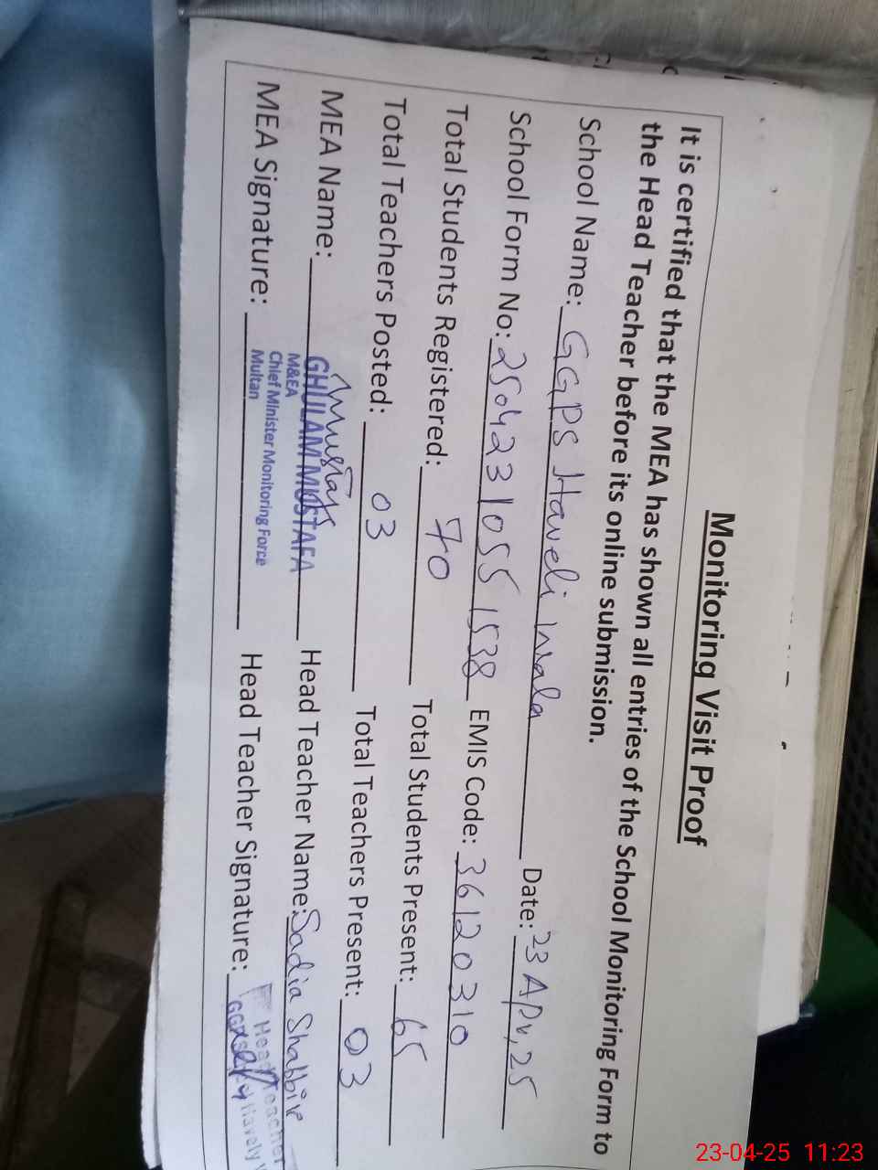| EMIS Code: 36120310 | Name of School: GGPS HAVALI WALA SHUJABAD | |||