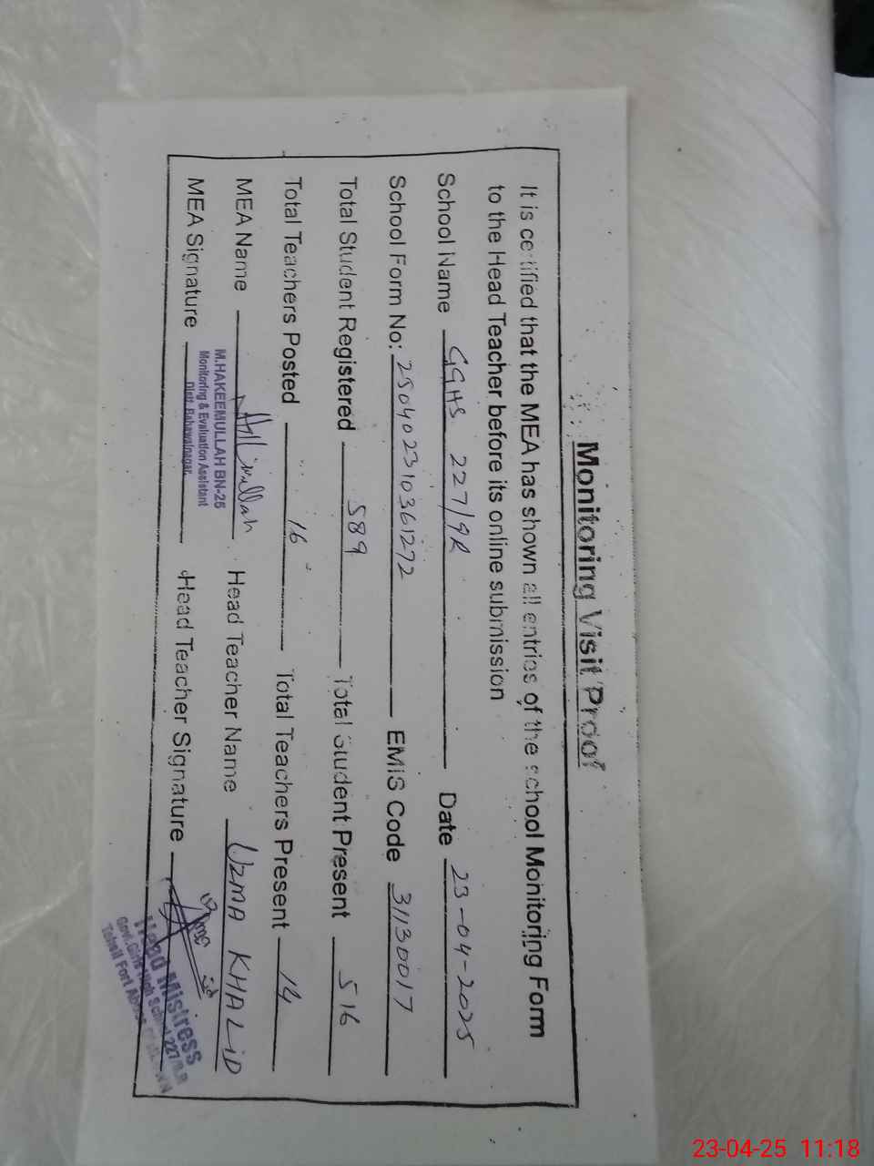 | EMIS Code: 31130017 | Name of School: GGHS CHAK NO.227/9-R | |||