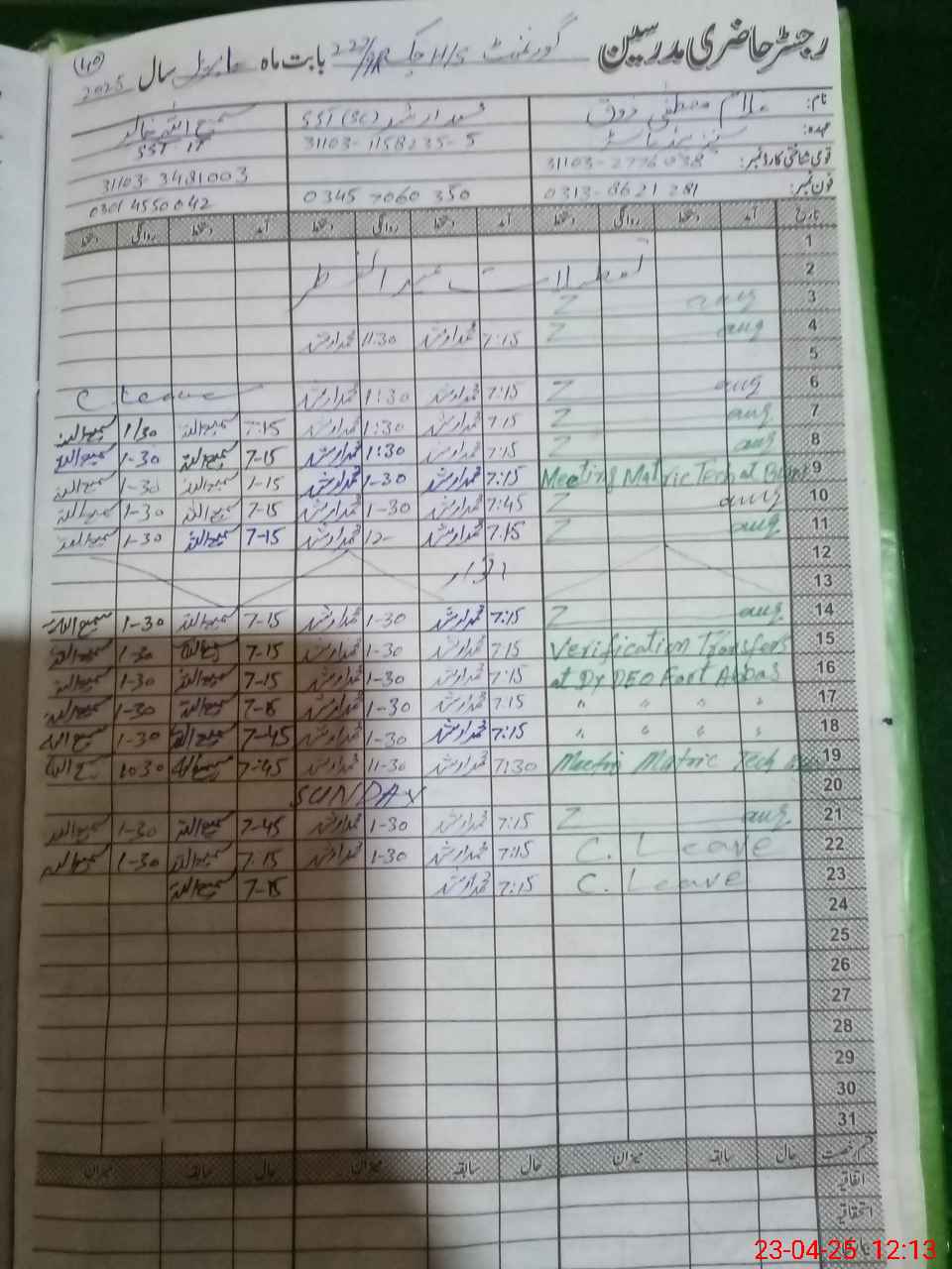 | CNIC | Full Name | Designation | R/C | Absence During Last Calender Month |