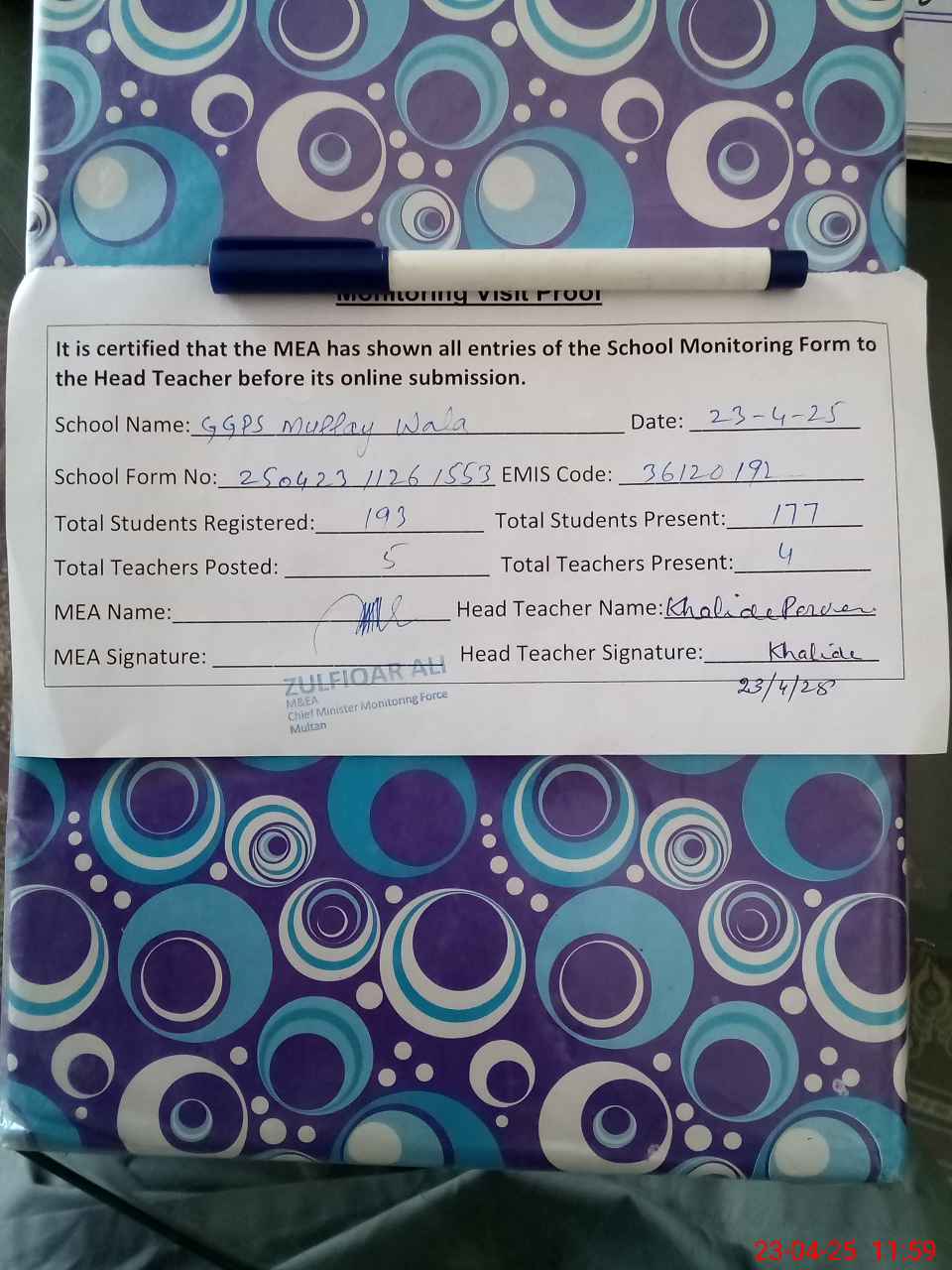 | EMIS Code: 36120192 | Name of School: GGPS MULLAY WALA MAUZA WAINS SHUJABAD | |||