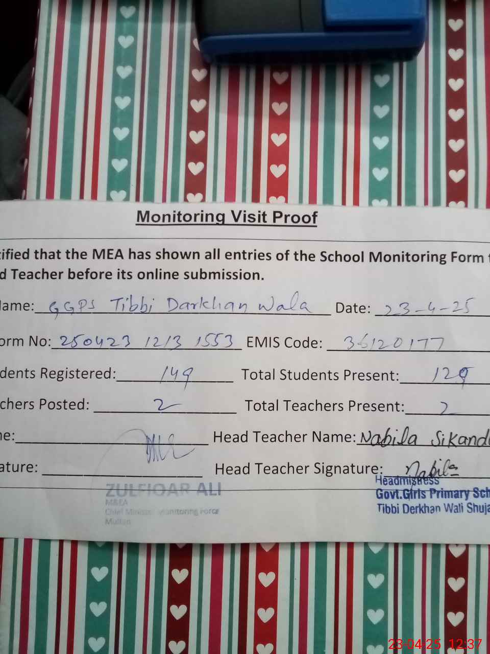 | Attendance Register | Head Teacher | MEA with School | Visit Proof |