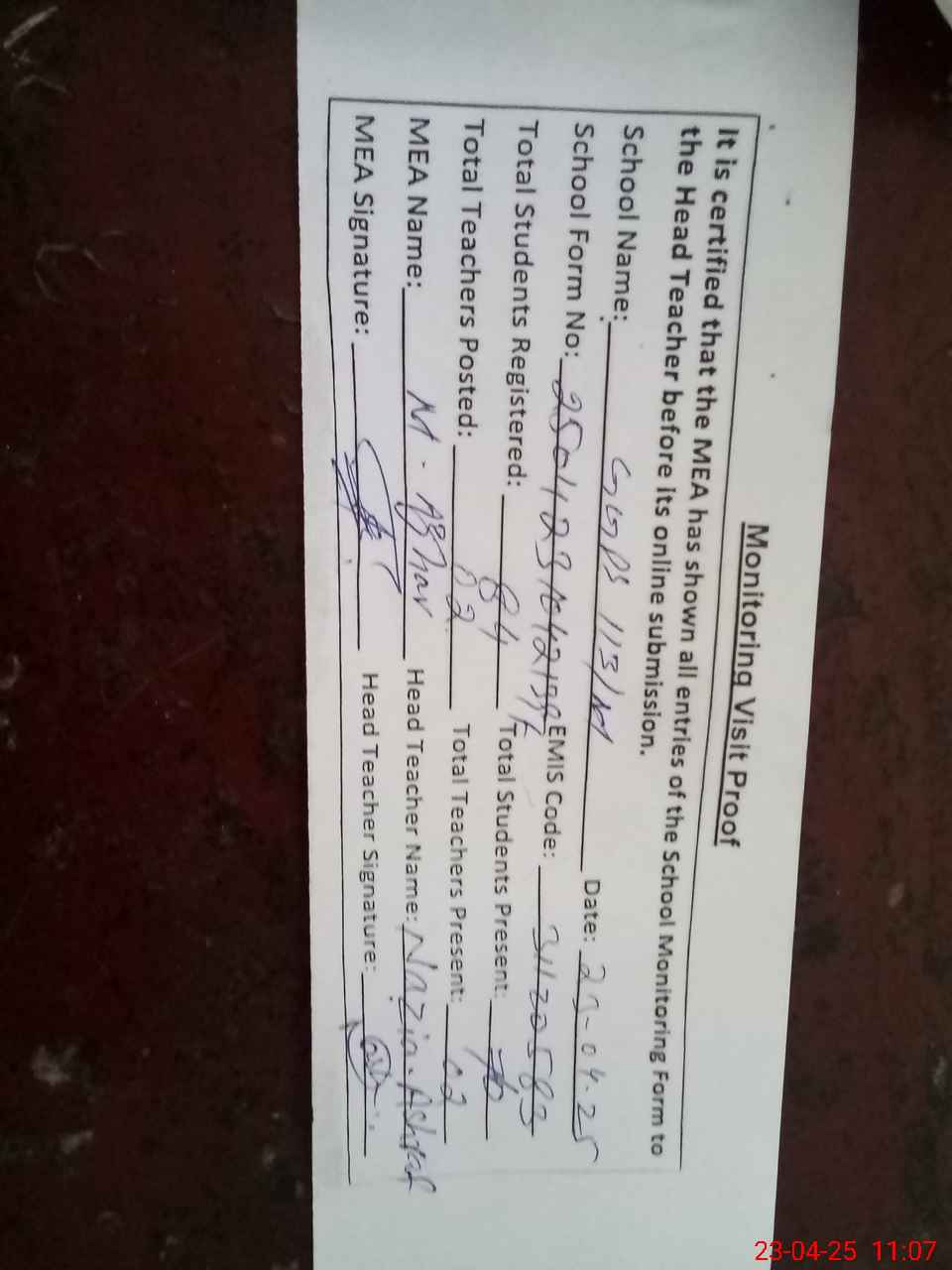 | Attendance Register | Head Teacher | MEA with School | Visit Proof |