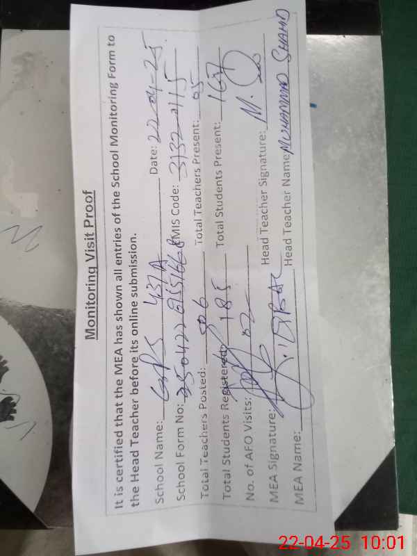 | Attendance Register | Head Teacher | MEA with School | Visit Proof |