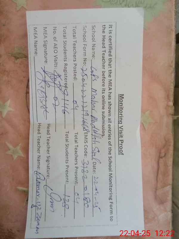 | Certified that this School was Inspected by the Undersigned MEA/DMO Today and the Information Stated Above is as Per Record. | |||||