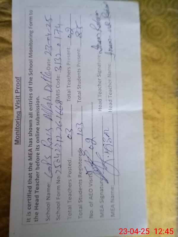 | Attendance Register | Head Teacher | MEA with School | Visit Proof |